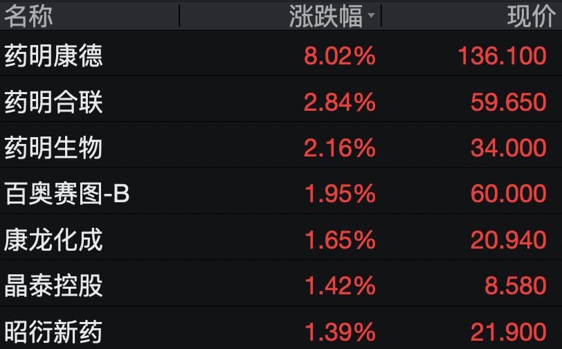 创新药概念股走高,药明康德涨超8%,药明合联、药明生物涨超2%。