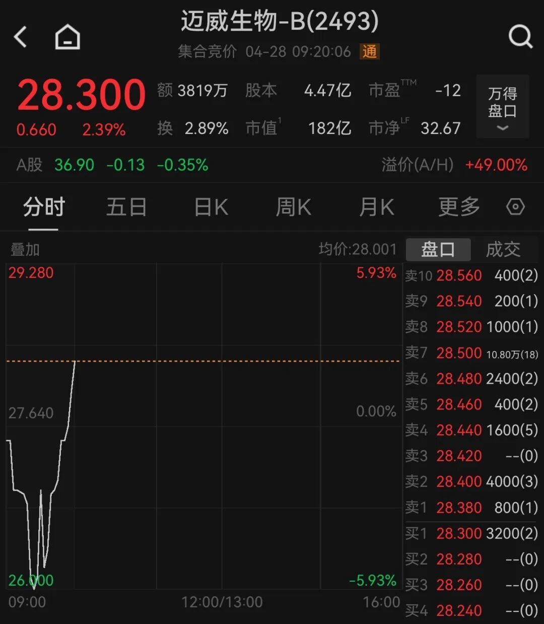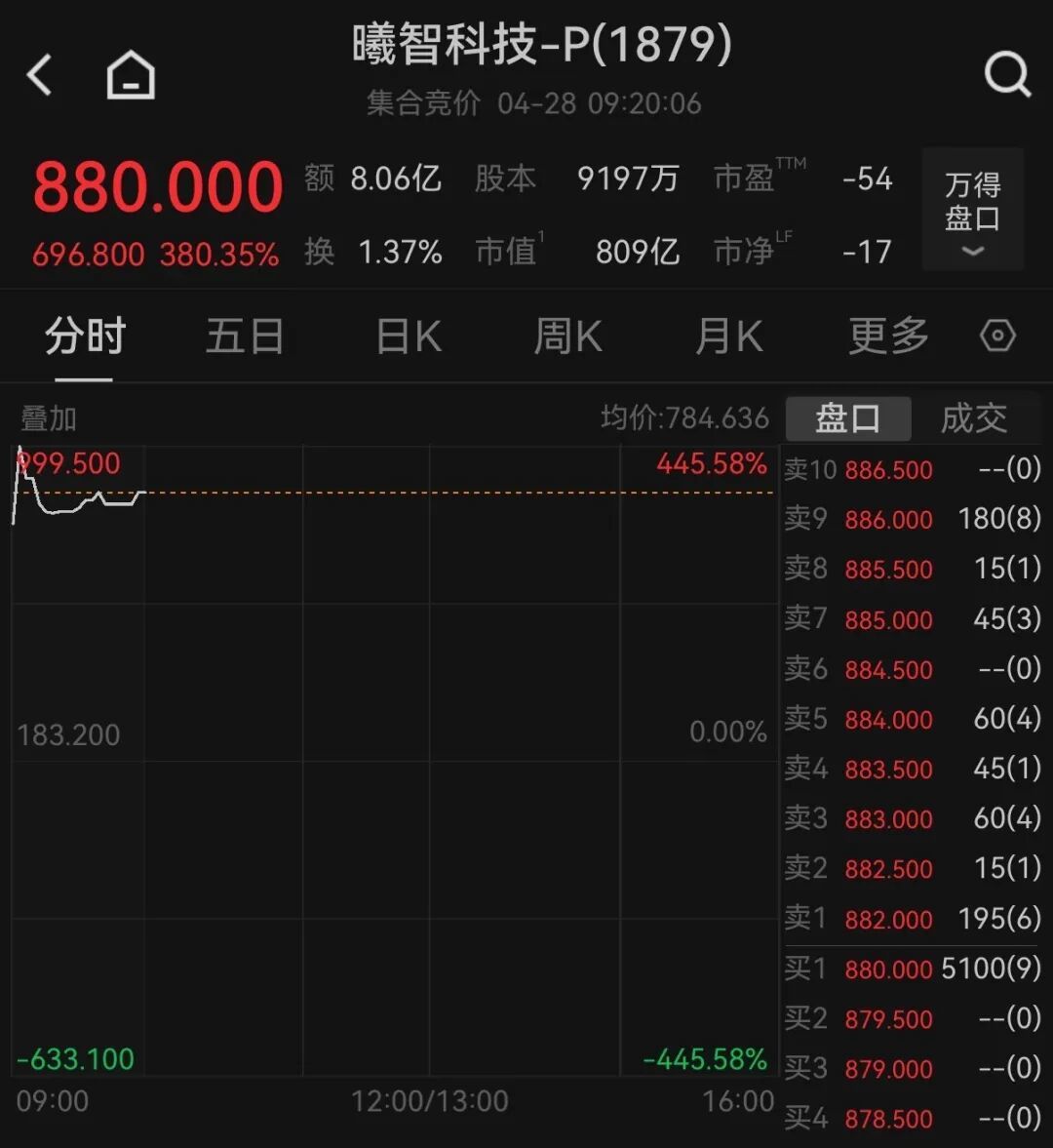 今日两只新股在港交所上市,曦智科技涨超380%,股价报880港元;迈威生物涨超2%,股价报28.3港元。