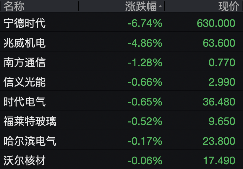 电气设备股领跌,宁德时代跌超6%,兆威机电跌近5%,南方通信跌超1%。
