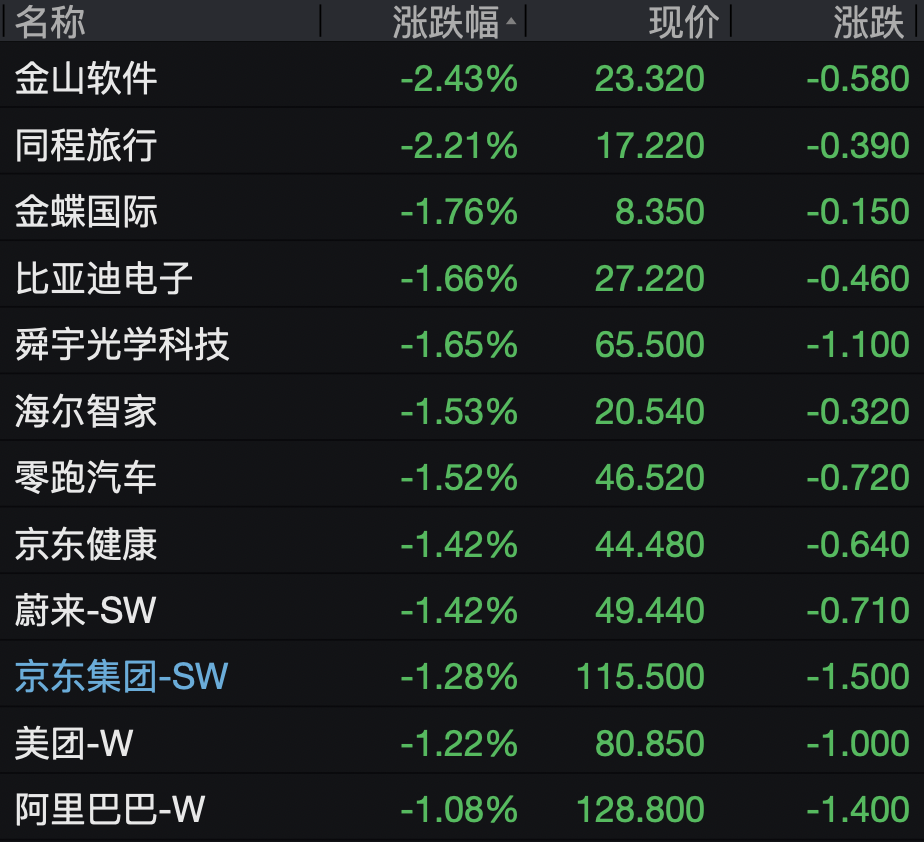 科网股多数下跌,金山软件跌超2%,金蝶国际、比亚迪电子、京东集团、美团、阿里巴巴均跌超1%。
