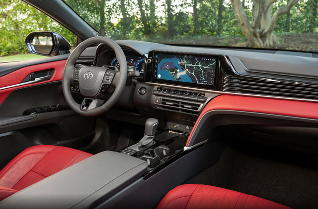 凯美瑞2.5L HEV XSE AWD版本在内饰方面,跟国内的车型还是有一些区别的,能看出一些雷克萨斯车型的影子,该版本内饰由黑色和酒红色组成,中控台还增加了钢琴烤漆面板,中控屏的尺寸为12.3英寸,该版本还支持无线充电,丰田Safety Sense 3.0,JBL音响等配置。